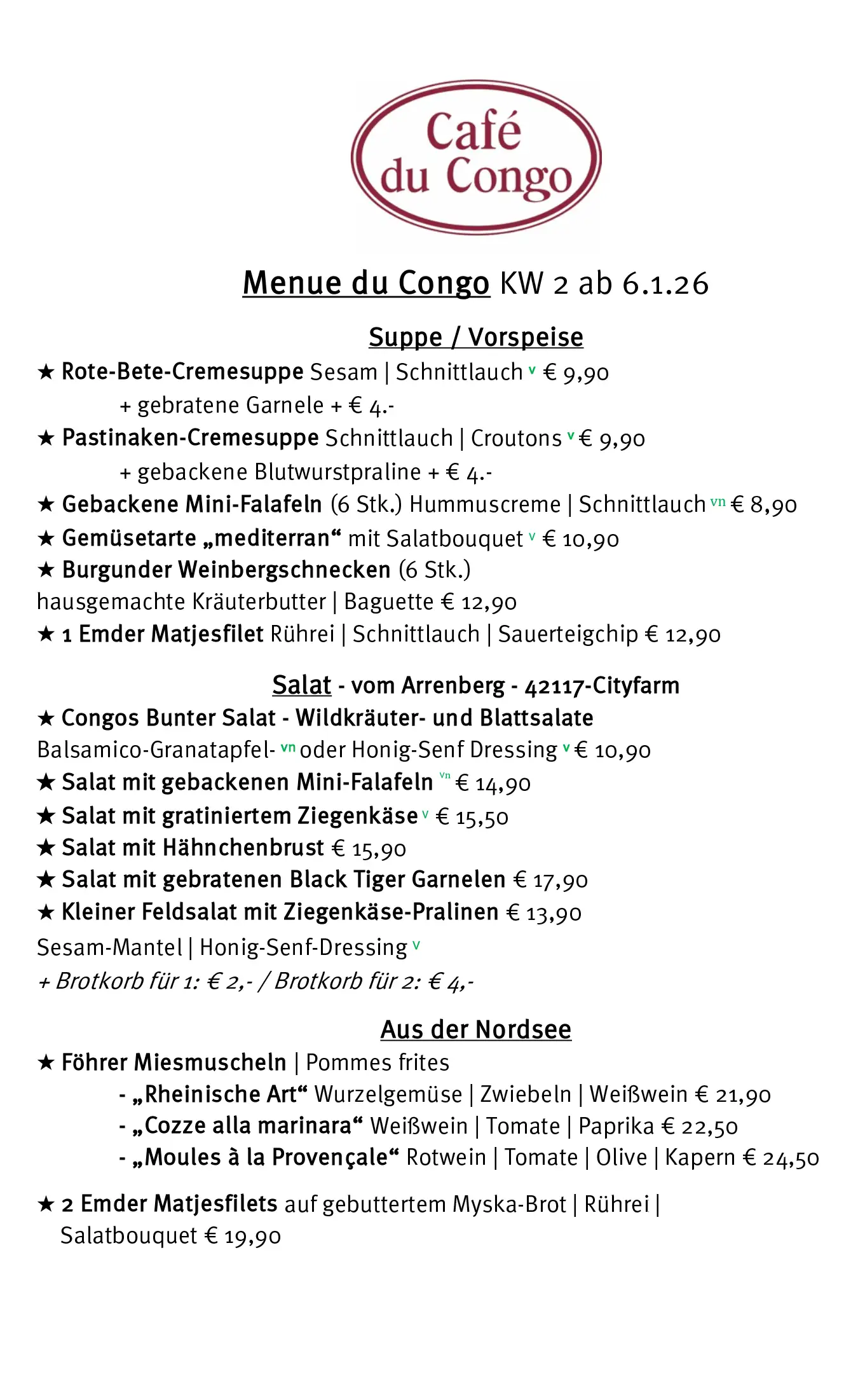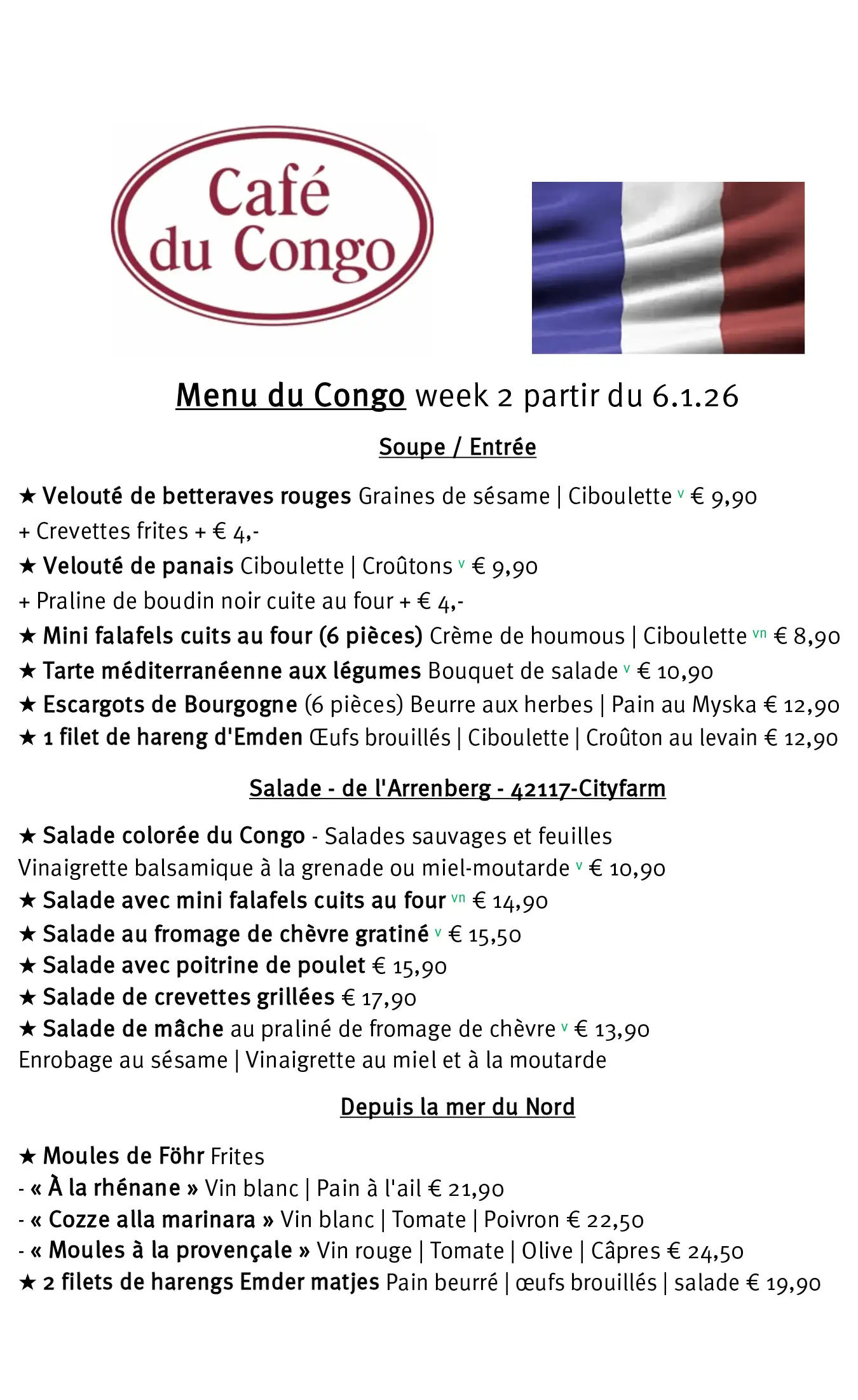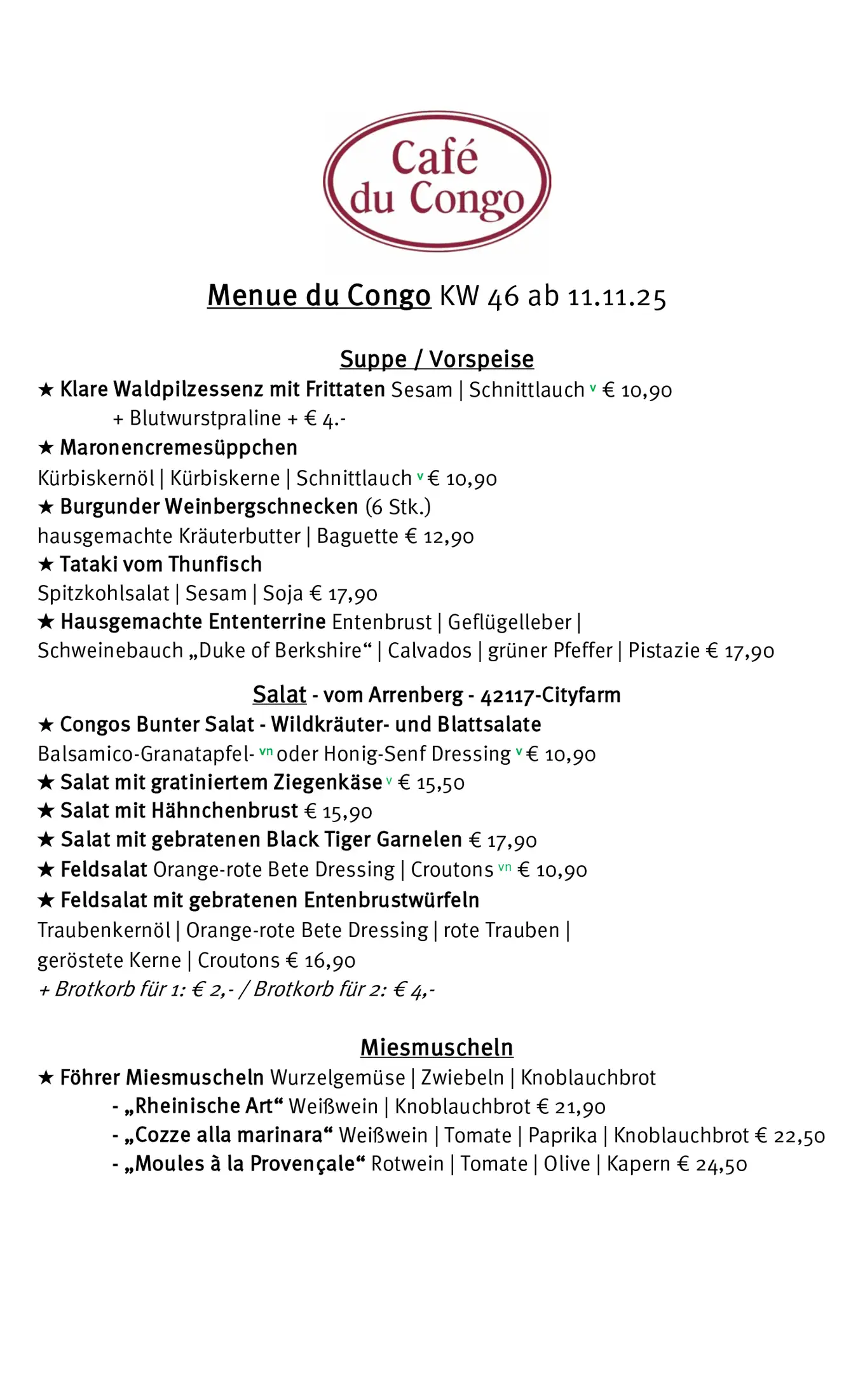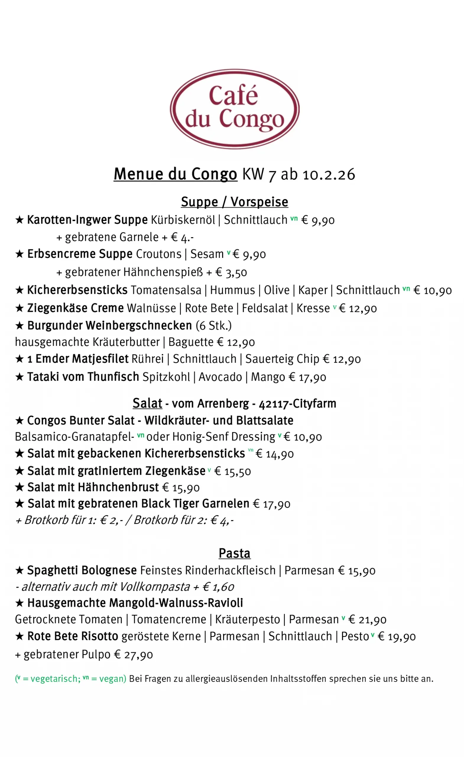 Unsere wechselnden Gerichte spiegeln, was heute als Crossover-Küche bezeichnet wird: Gerichte von bürgerlich bis international – zubereitet immer aus frischen Zutaten. Unsere Speisekarte bietet Vegetarisches, Veganes und Tierisches. Bei uns gibt es gutes Essen in ungezwungener Atmosphäre. Kein Wunder also, dass viele unserer Stammgäste das Café du Congo ihr Wohnzimmer nennen.