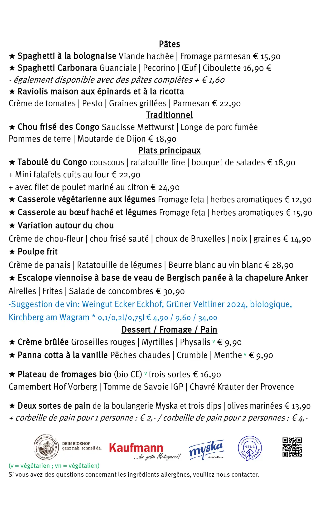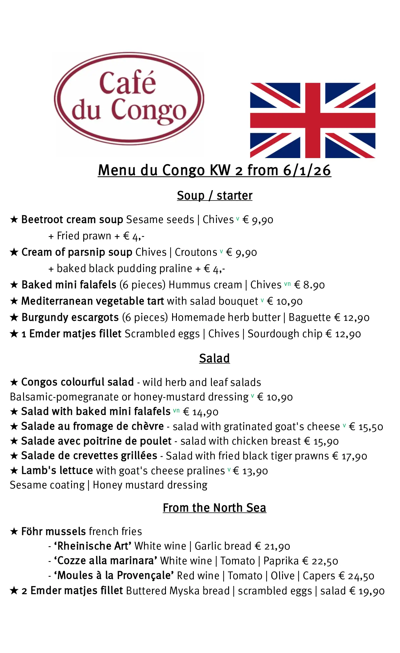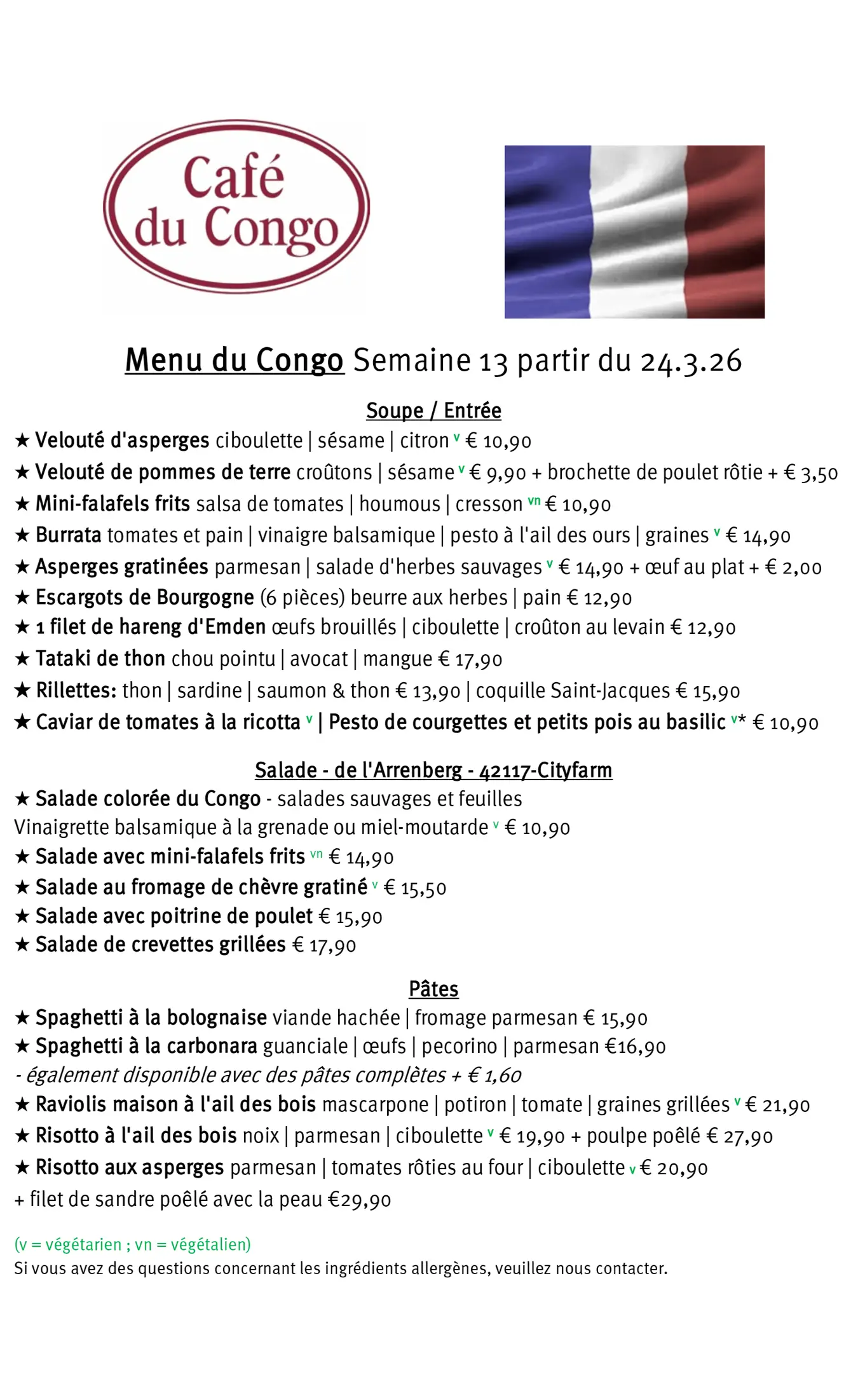 Unsere wechselnden Gerichte spiegeln, was heute als Crossover-Küche bezeichnet wird: Gerichte von bürgerlich bis international – zubereitet immer aus frischen Zutaten. Unsere Speisekarte bietet Vegetarisches, Veganes und Tierisches. Bei uns gibt es gutes Essen in ungezwungener Atmosphäre. Kein Wunder also, dass viele unserer Stammgäste das Café du Congo ihr Wohnzimmer nennen.