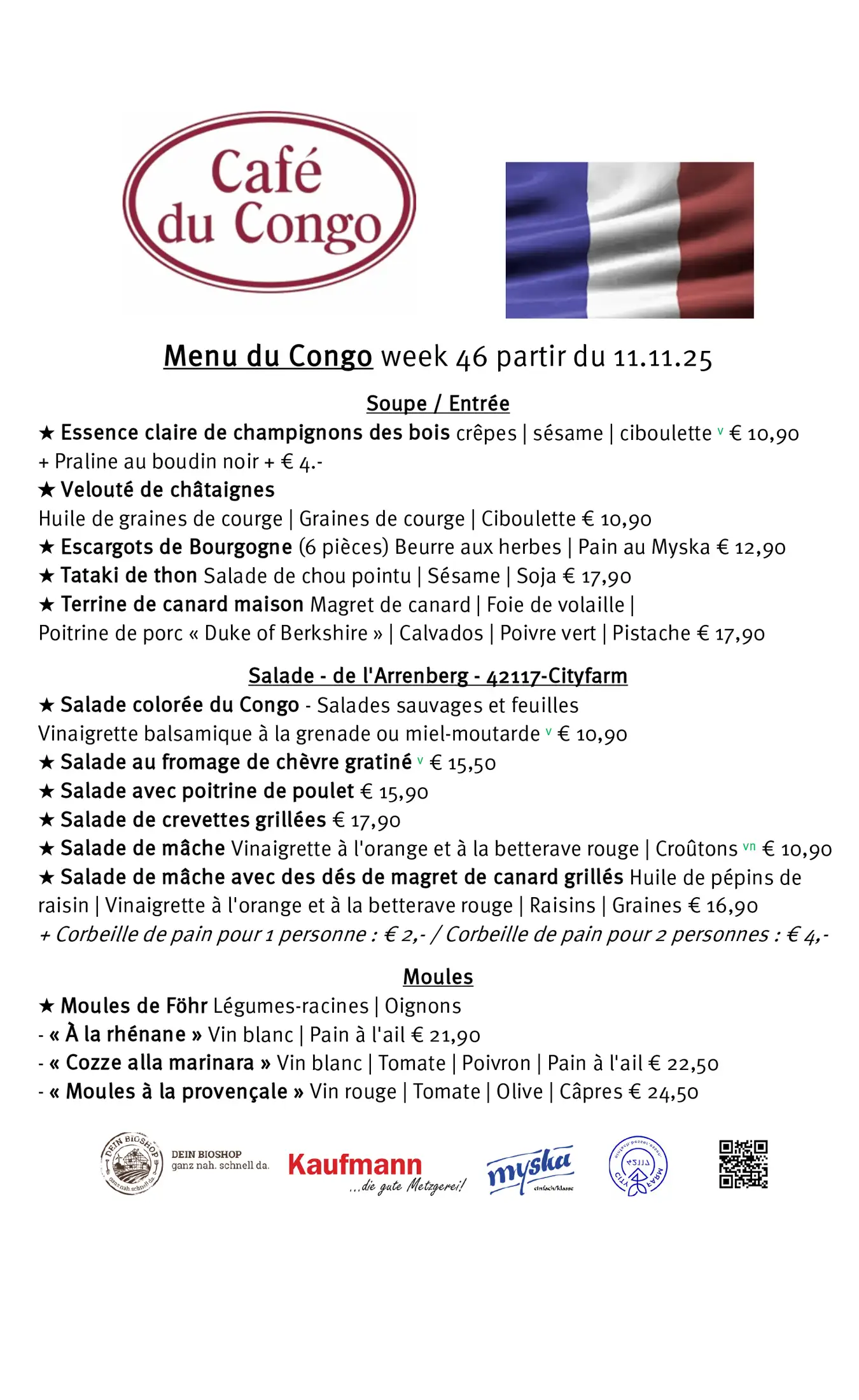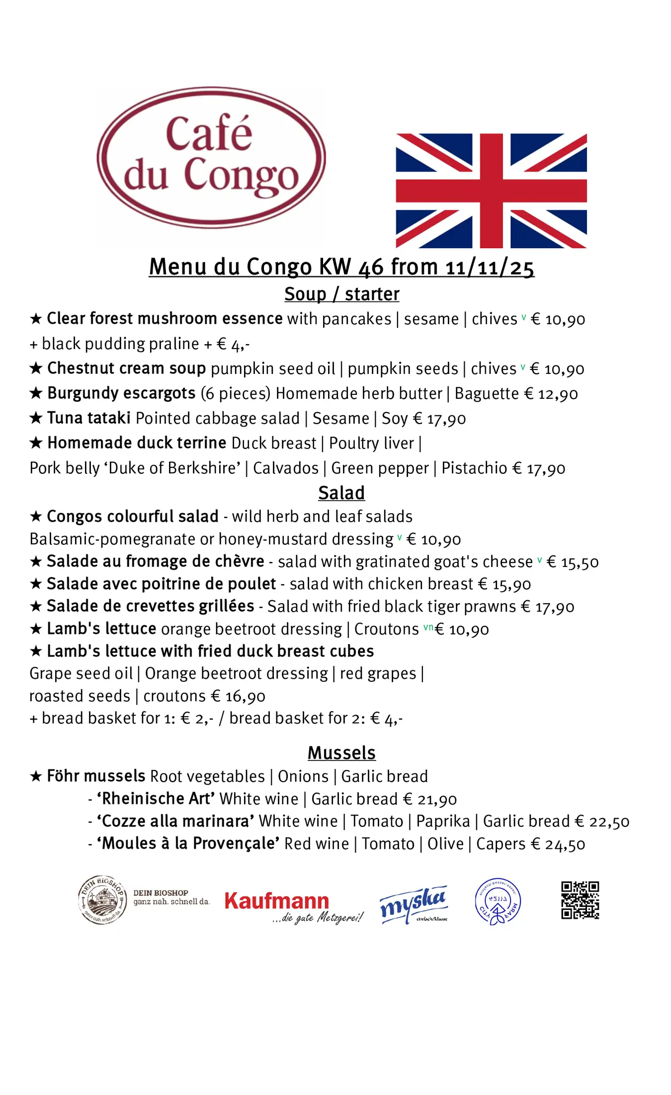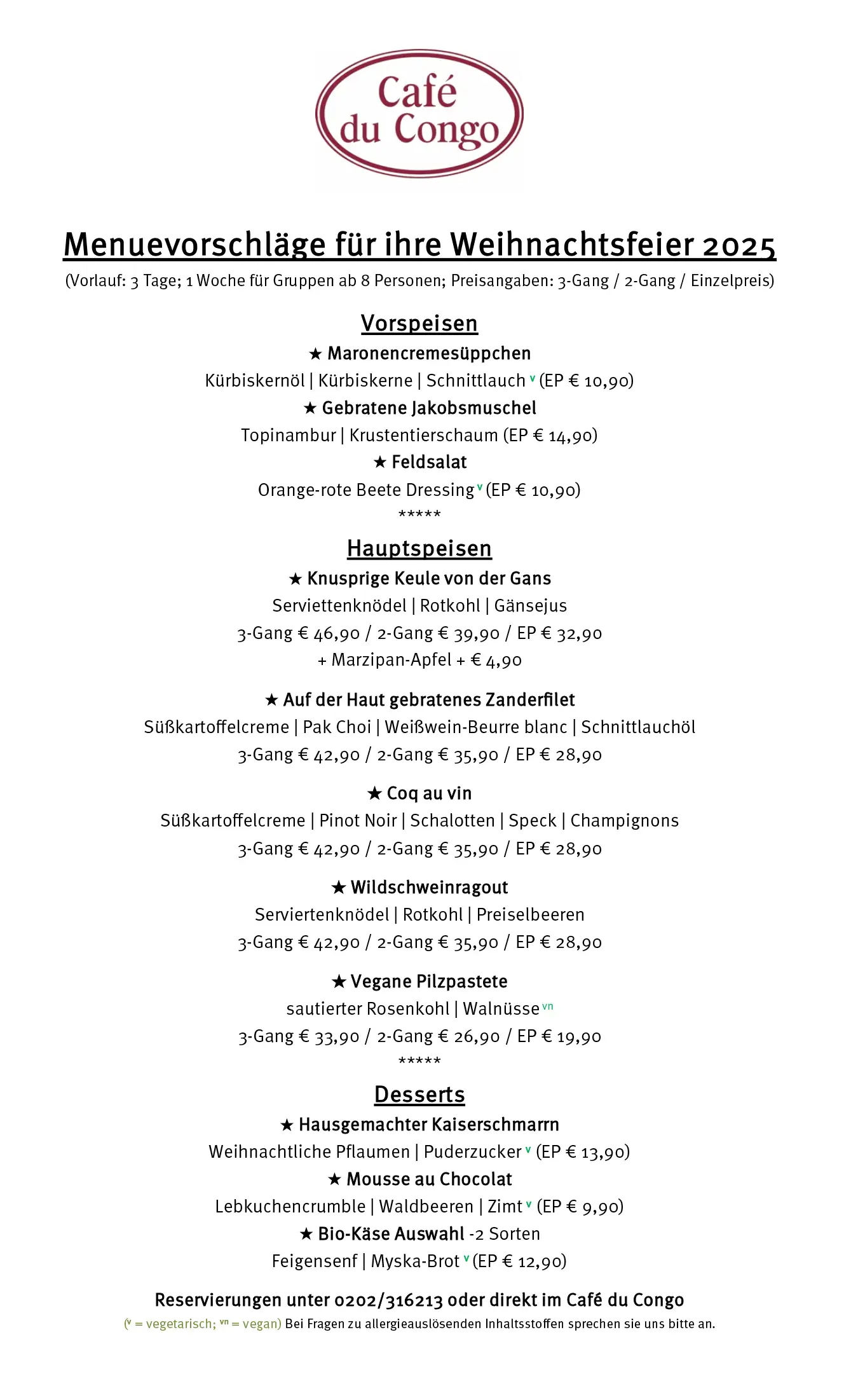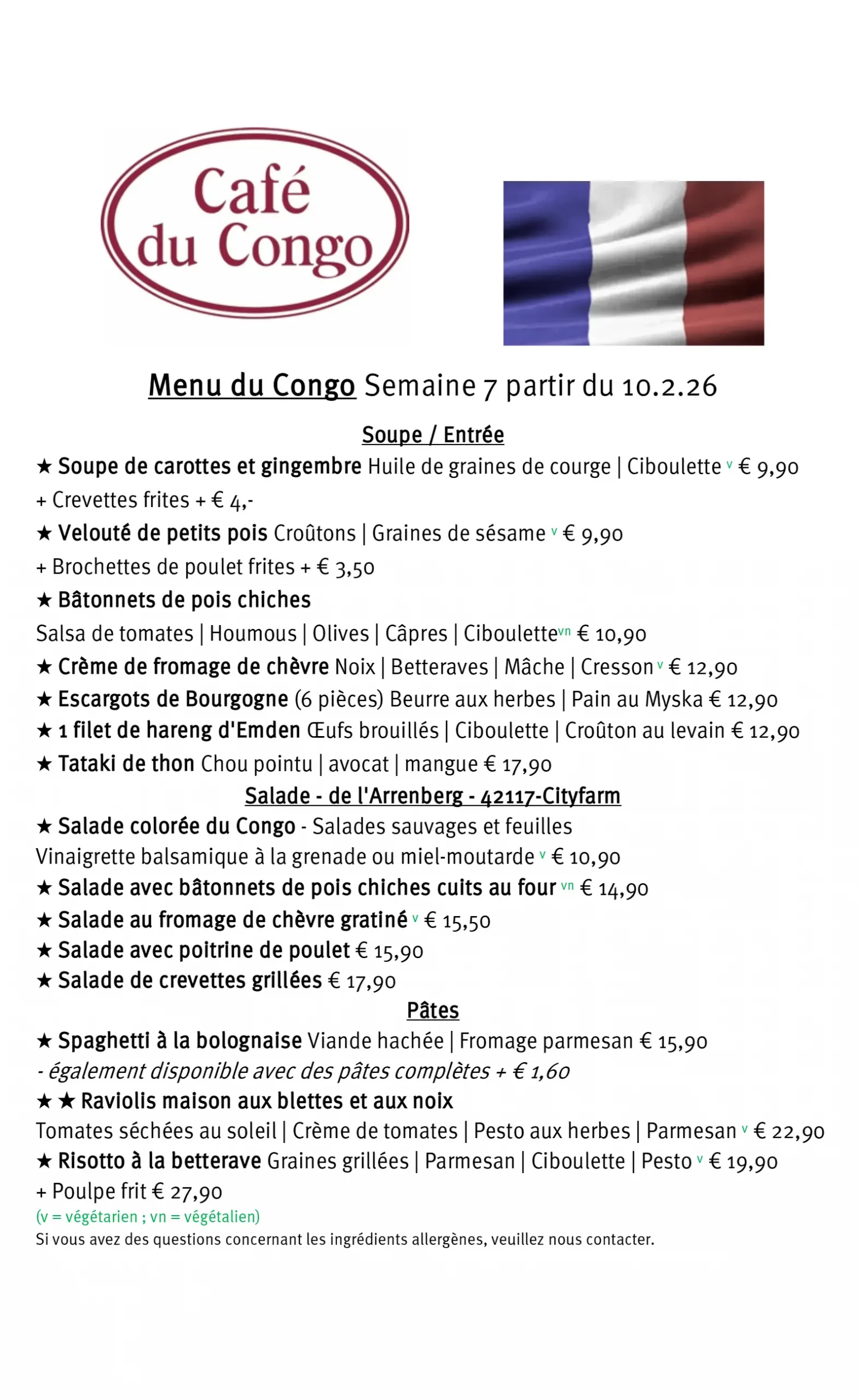 Unsere wechselnden Gerichte spiegeln, was heute als Crossover-Küche bezeichnet wird: Gerichte von bürgerlich bis international – zubereitet immer aus frischen Zutaten. Unsere Speisekarte bietet Vegetarisches, Veganes und Tierisches. Bei uns gibt es gutes Essen in ungezwungener Atmosphäre. Kein Wunder also, dass viele unserer Stammgäste das Café du Congo ihr Wohnzimmer nennen.